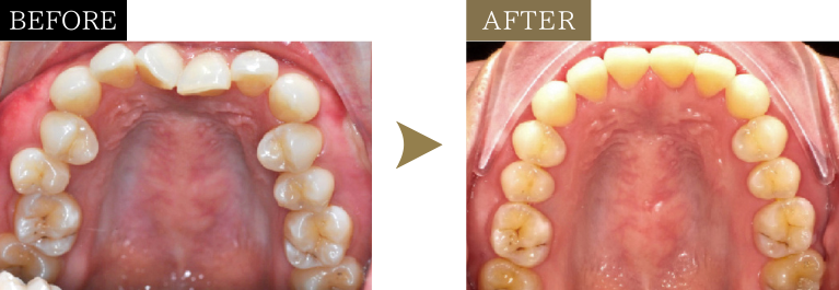 インビザラインフルを使用し、お口全体の噛み合わせと同時に歯並びも矯正した結果、前歯の捻転や叢生はもちろん、過蓋咬合もしっかりと改善できました。写真を見ると、歯並びがキレイなアーチを描いていること、そして隠れていた下の前歯が見えるようになっていることがお分かりいただけるかと思います。この仕上がりを見て、患者さまは大変満足されていました。