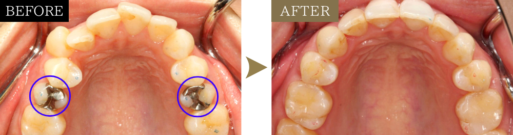 こちらの患者さまは、第一小臼歯は虫歯や治療の跡がない健全歯で、第二小臼歯(写真内青丸)に大きな銀歯が入っていたので健康な歯は抜かずに、第二小臼歯を抜歯することにしました。