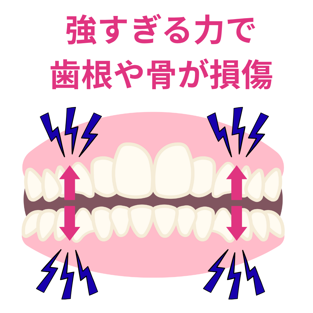 もし強すぎる力をかけ続けると、場合によっては歯の根が溶けて短くなる「歯根吸収」や、歯を支える骨自体が溶ける「歯槽骨の吸収」を引き起こす危険性があり、歯の寿命を著しく縮めてしまいます。