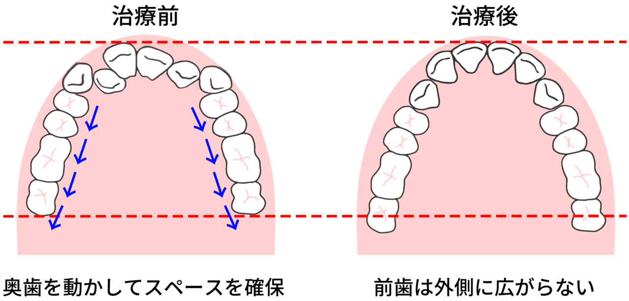 親知らずを抜いたスペースに奥歯を順繰りに動かすことで、前歯を並べるスペースを確保できます。